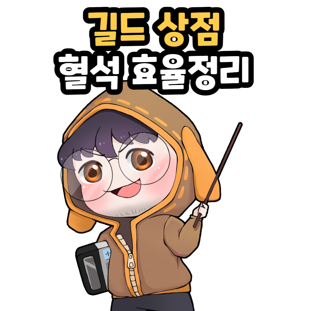 꾸준한 길드 활동을 통해 쌓인 실마엘 혈석은 길드 상점에서 각종 재화들로 교환이 가능합니다. 그러나 재화의 종류가 너무 많기에 어떤 걸 우선적으로 교환해야 할 지 직관적으로 판단하기 어렵습니다. 본 포스팅에서는 길드 상점에서 교환 가능한 모든 재화들에 대하여 2023년 10월 17일 기준 직전 7일의 평균시세를 반영하여 이들의 교환 효율을 모두 정리해 보았습니다.