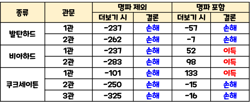 이러한 요소들을 모두 고려하여 더보기가 이득인지 손해인지 모든 군단장 레이드 및 카양겔에 대해 관문별로 계산을 해봤습니다. 캐릭터의 상황에 따라 다음과 같은 3가지 케이스로 분류를 했습니다.